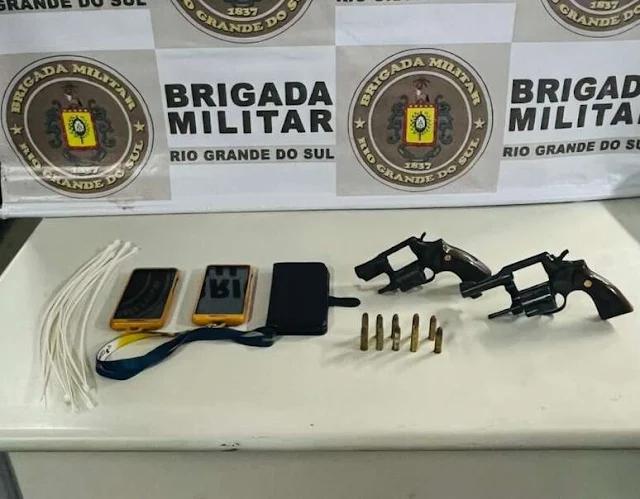 Durante a operação, a polícia confiscou dois revólveres calibre .38, 10 munições intactas, lacres de plástico, um celular e diversos aparelhos eletrônicos roubados.